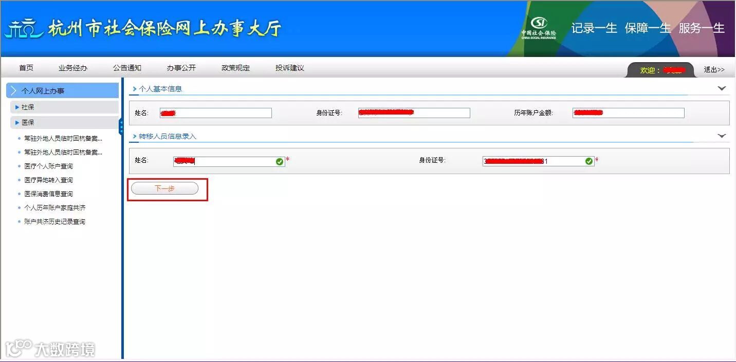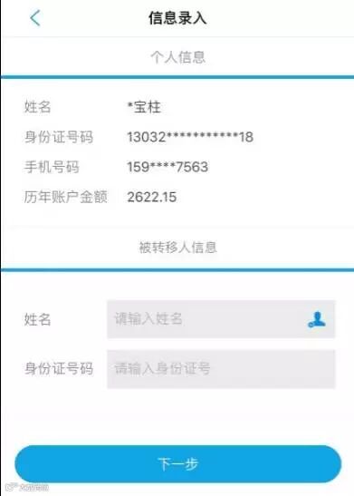 - 输入转入人姓名、身份证号,点击“下一步”;