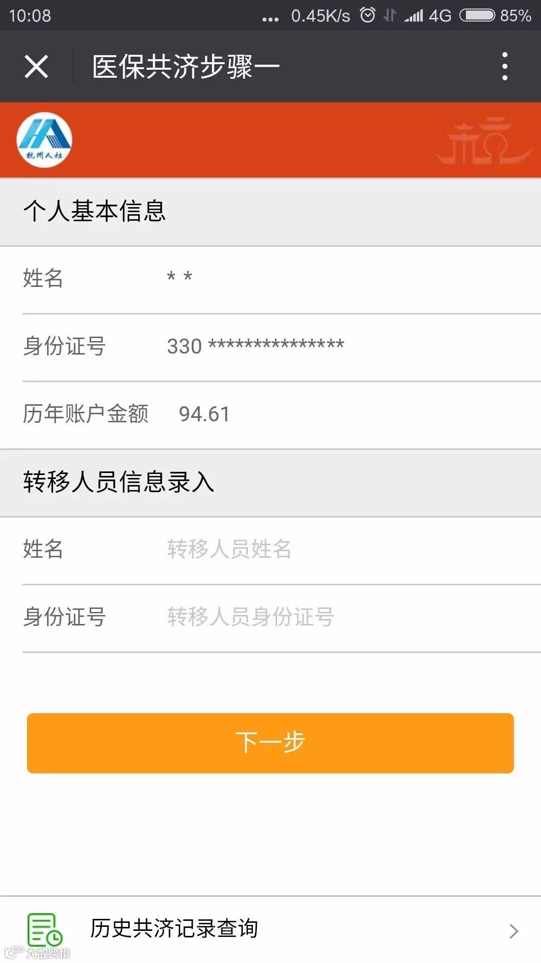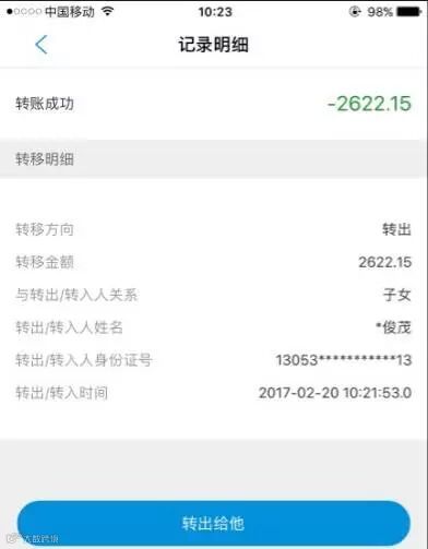 - 输入被转移人姓名、身份证号(或从历史记录中选择);
