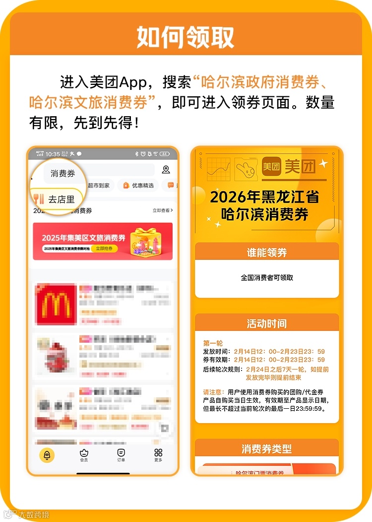 领取方式:进入美团App/大众点评App,搜索“哈尔滨政府消费券”或“哈尔滨文旅消费券”,即可进入领券页面,数量有限,先到先得。
