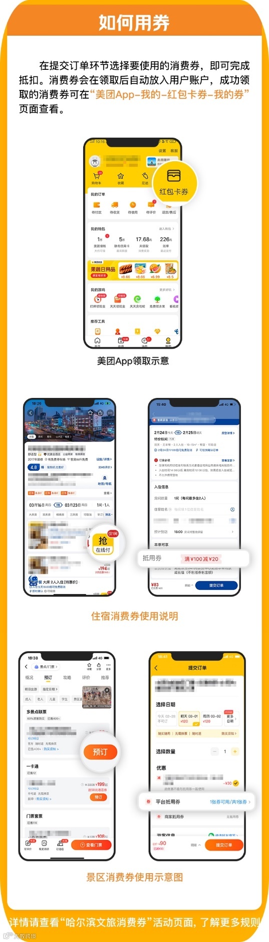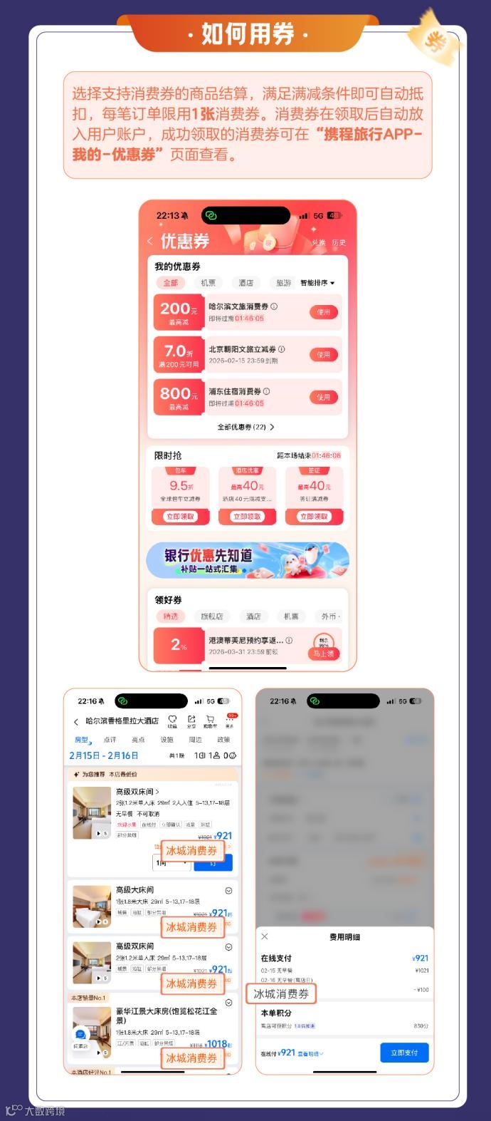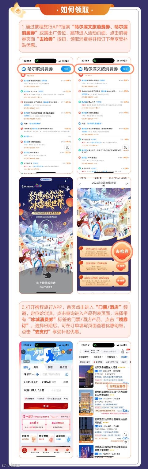 领取方式:在携程旅行APP/小程序,可通过首页“门票/酒店”频道定位哈尔滨,选择带“冰城消费券”标签的产品点击“领券订”,或直接搜索“哈尔滨文旅消费券”进入活动页面抢券。