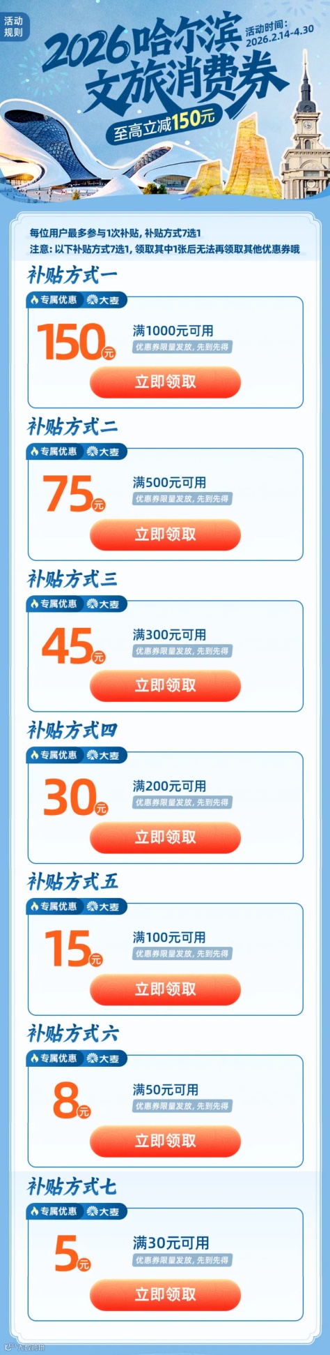 领取方式:用户进入大麦/淘票票App(含微信小程序、支付宝小程序、淘宝小程序),搜索「哈尔滨文旅券」或在首页相关广告位点击进入消费券专属活动页面,点击领券后,进入商品详情页面购买补贴商品,并在购票结算阶段享受补贴优惠。