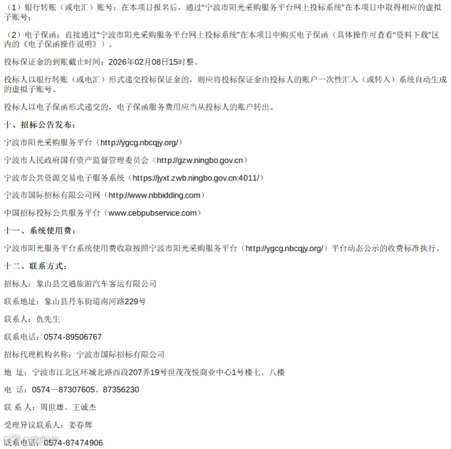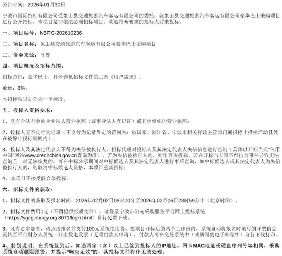 2026年1月30日,浙江省宁波市象山县交通旅游汽车客运有限公司豪华巴士采购项目招标公告发布。该项目计划采购豪华巴士8辆,资金来源为自筹,开标时间为2月10日9时30分。