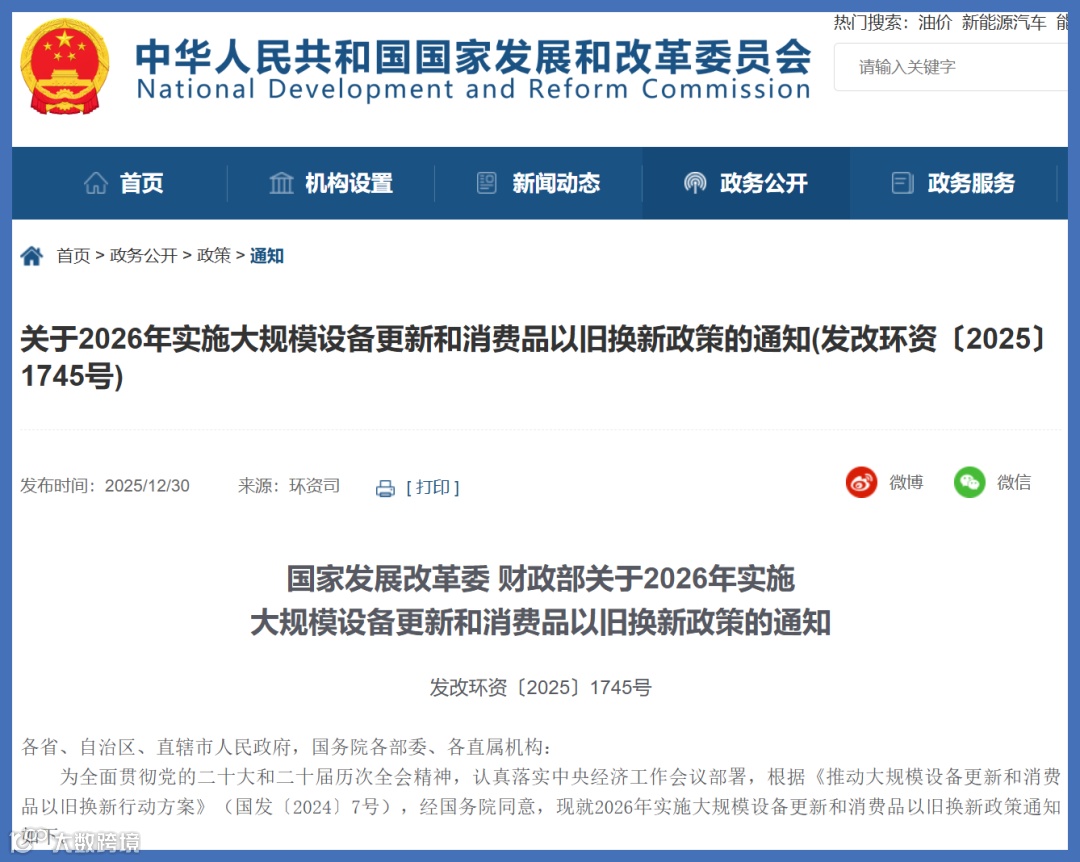 2025年12月30日,国家发展和改革委员会、财政部发布《关于2026年实施大规模设备更新和消费品以旧换新政策的通知》,明确2026年“两新”政策的支持范围、补贴标准和工作要求。