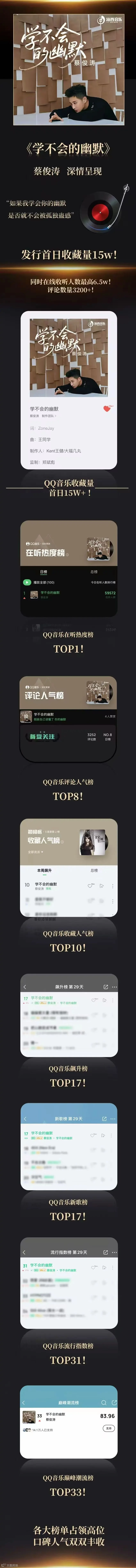 “原谅我学不会你的幽默,消费着痛苦供他人取乐。”海西传媒集团副董事长蔡俊涛新歌《学不会的幽默》正式上线!QQ音乐在听热度榜TOP1!发行首日收藏量15w,同时在线收听人数最高6.5w,评论数量3200+。用旋律深情呈现,以歌声收获满满喜爱,每一份数据都是最真挚的回响!快来一起听歌吧~
