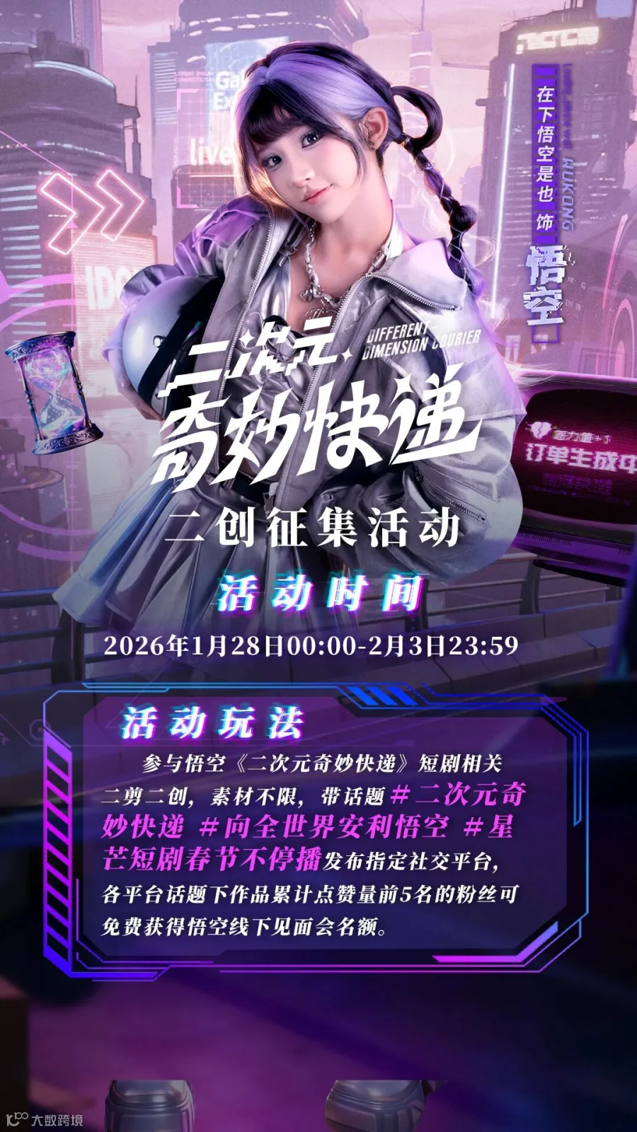 用精彩视频,碰撞奇妙灵感。快来参与在下悟空是也《二次元奇妙快递》二创征集活动,解锁福利惊喜,用创意出圈,等你来参与。2月4日起锁定快手《二次元奇妙快递》全网独播!