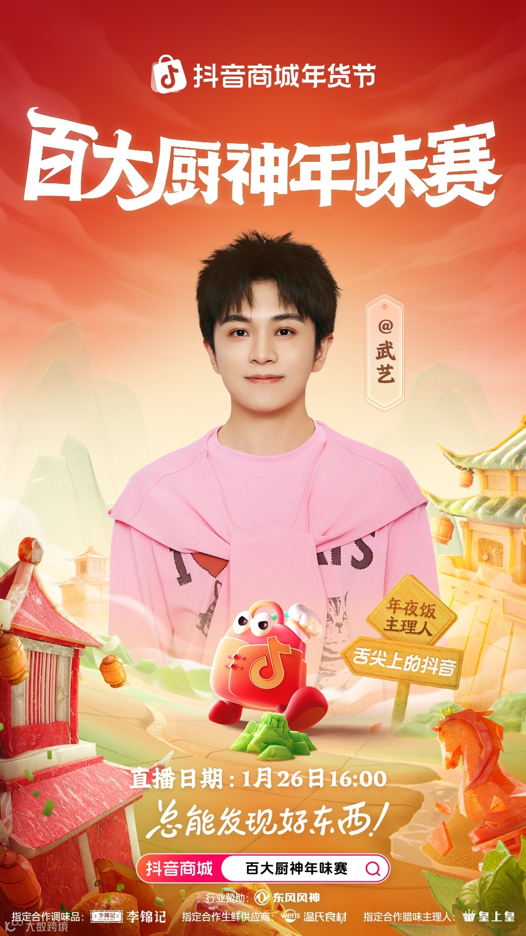 《抖音商城年货节》武艺化身年夜饭主理人,邀你共赴百大厨神年味赛!一起解锁地道年味,嗨购新春好物!