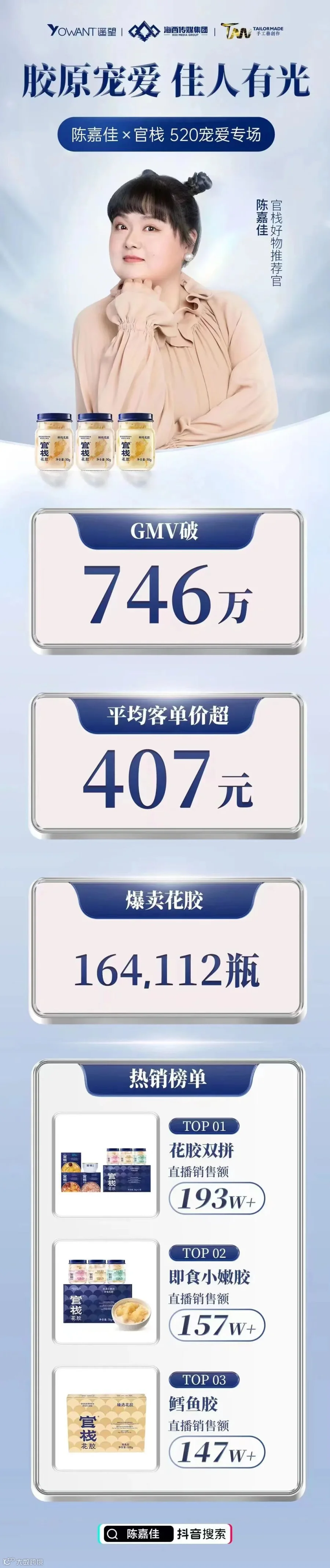 官栈好物推荐官陈嘉佳抖音直播间再创佳绩!“陈嘉佳X官栈520宠爱专场”最新战报来袭:直播GMV突破746万!爆卖花胶164112瓶!平均客单价超407元!胶原宠爱,佳人有光!上抖音搜索陈嘉佳(ID:vivien_0529),共赴美丽之约!