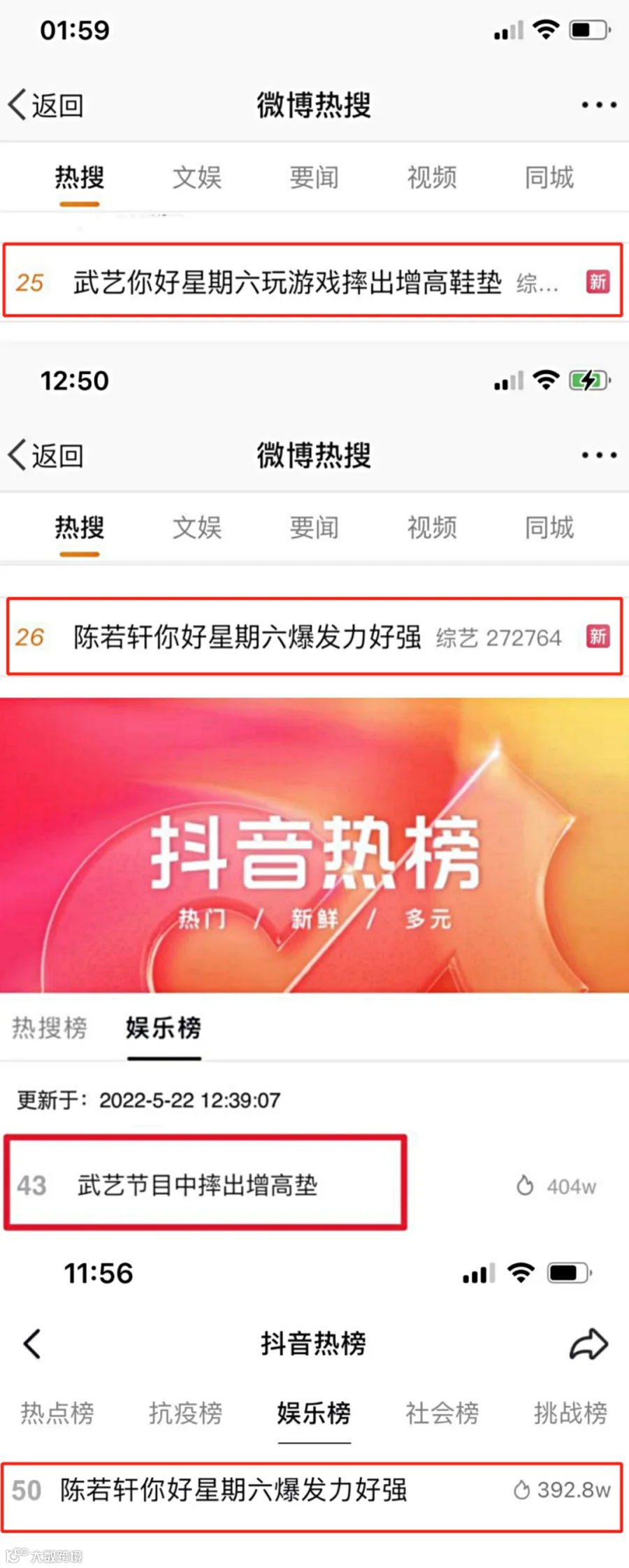 在综艺之神的眷顾下,武艺再创爆笑名场面:游戏途中摔出增高鞋垫!为武艺溢出来的比赛精神点赞~相关话题#武艺你好星期六玩游戏摔出增高鞋垫#登上热搜榜TOP25,#武艺节目中摔出增高垫#登上抖音娱乐榜TOP43。除此之外,武艺还带来了《破晓》首秀舞台!挑战唱跳,暴风蜕变!