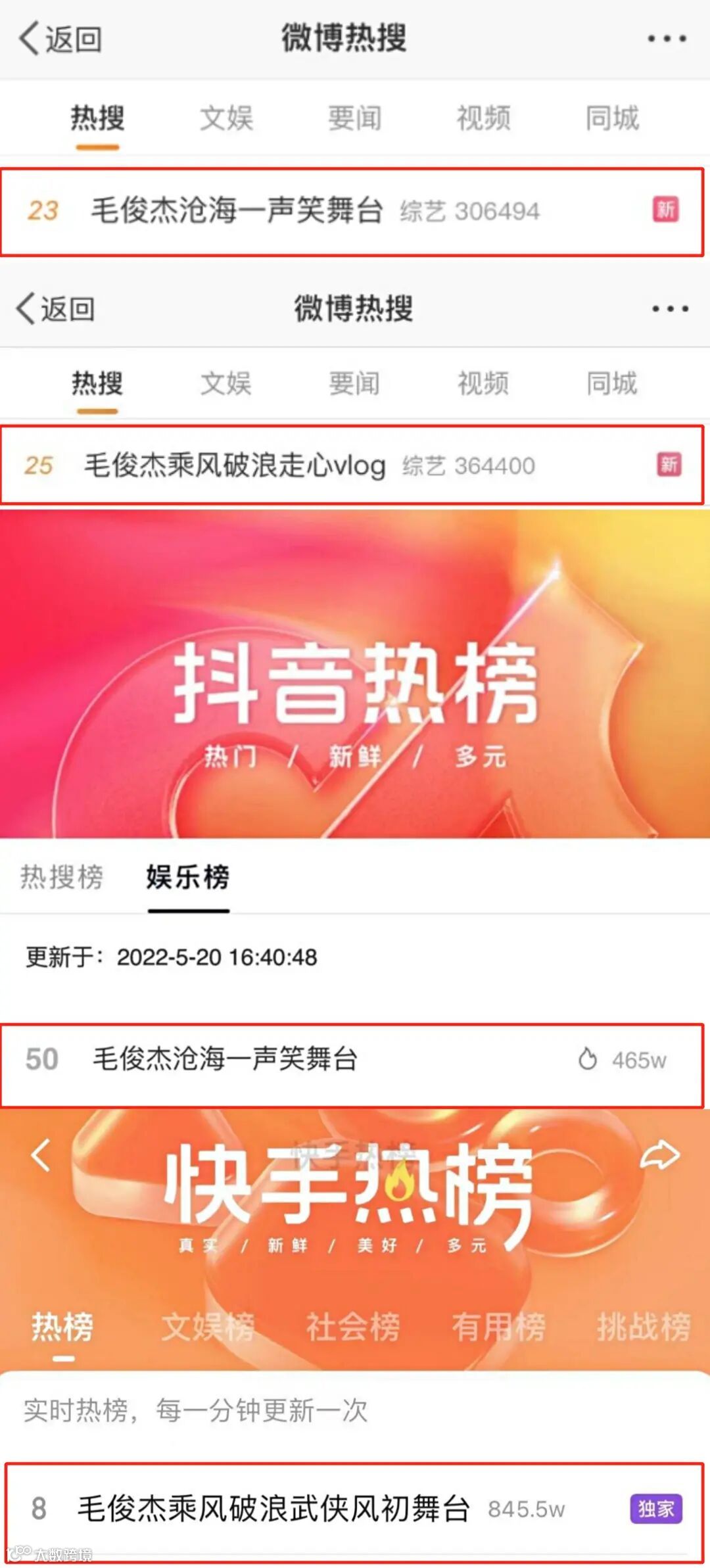 毛俊杰以一曲豪情满怀的《沧海一声笑》,开启了乘风破浪之旅,一身古风劲装唱出坦荡前行与写意江湖,飒气表演引发热议,#毛俊杰沧海一声笑舞台# 登上热搜榜第23名、抖音热榜第50名,#毛俊杰乘风破浪武侠风初舞台#登上快手总榜第8名。