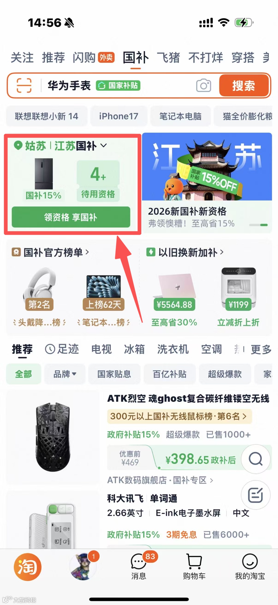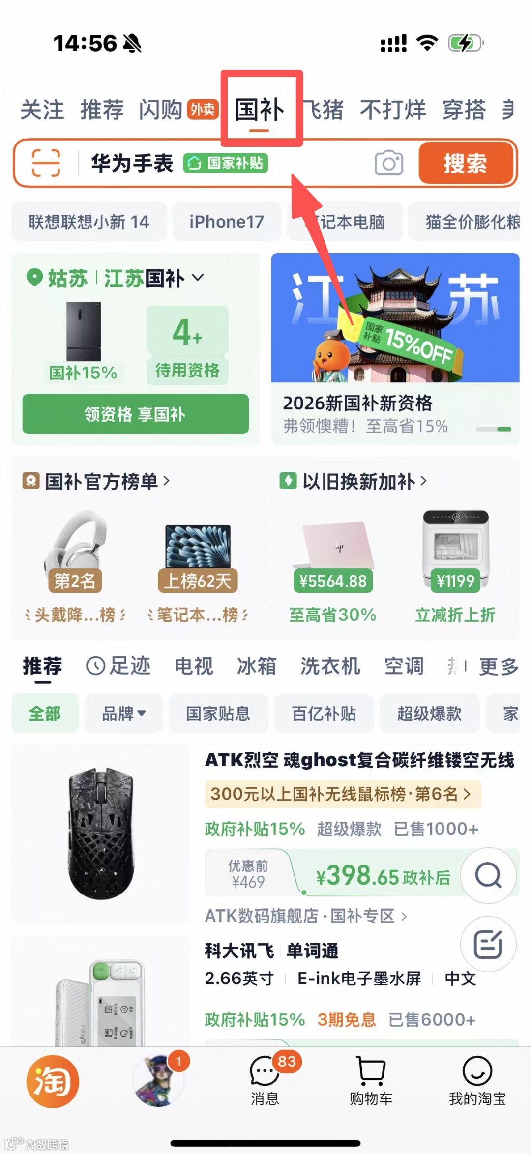 ✅进入淘宝app,在主页上方找到国补并进入国补专题。