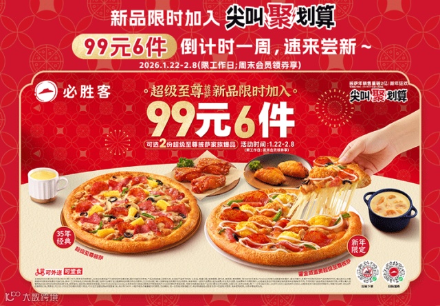 2026年1月22日至2月12日,必胜客会员可前往必胜客APP商城选购本次活动同款6件套组合券,凭券可兑换相应组合产品1份(期间工作日购券,全周可用;双休日购券,限下一工作日起可用)。