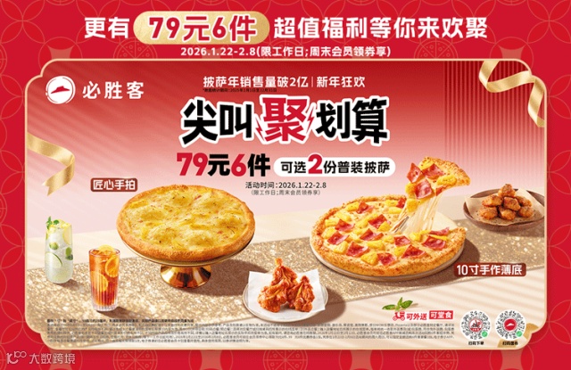 2026年1月22日至2026年2月8日,必胜客会员可前往会员领券中心领取79元6件、99 元6件优惠券各1张。凭券在1月22日-2月8日活动期间的周六周日,可以指定金额选购6件套套餐1份。电子券于APP、小程序端各点餐渠道均可使用。活动期间,同一会员每天限领取1次,电子券请前往必胜客会员卡包查看并使用,具体使用规则,以券详情说明为准。