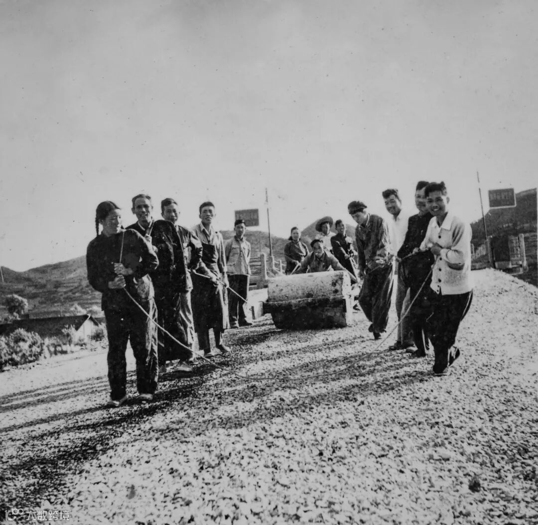 ▲图为工人们拉动公路石碾子修建103大桥桥面。图源:贵州省三穗公路管理段