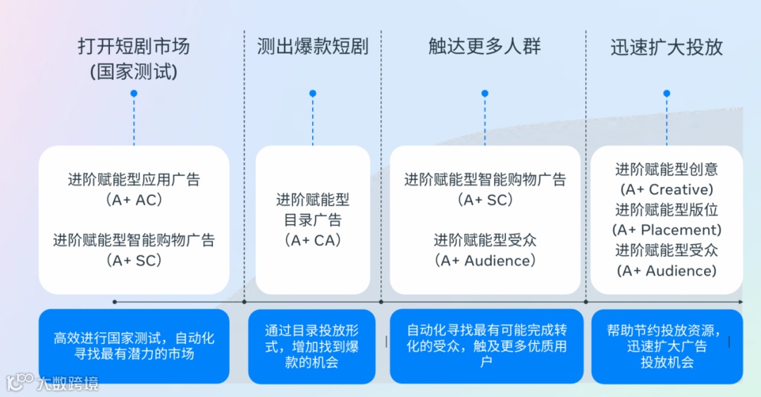 对于短剧这类非常吃素材的产品,进阶赋能型广告可以实现千人千面,自动生成个性化的广告素材,提高广告测试效率,也可以减少基建压力,建议可以先用ABO常规的跑点数据出来,再用ASC广告扩大规模,新户直接跑ASC风险不可控,对于小预算的投手不太适用。
