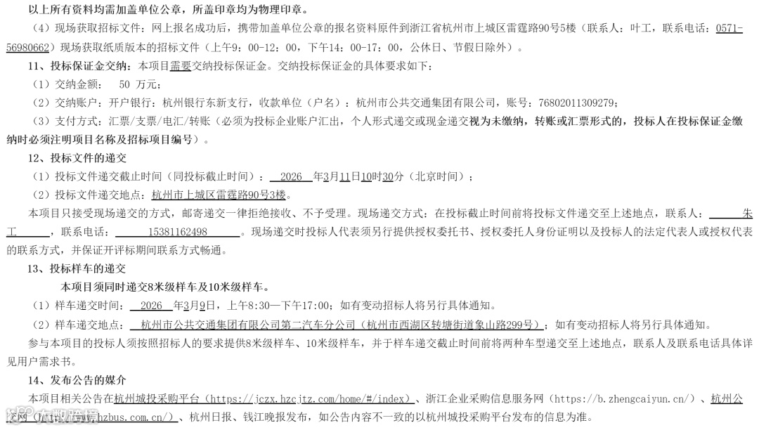 杭州市公共交通集团有限公司2026年1208辆纯电动城市公交客车采购及其8年全生命周期维保服务项目招标公告