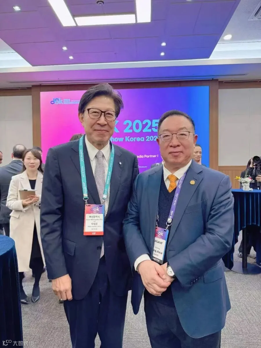 杨金才主席与釜山市市长朴亨俊在DSK2025大会VIP活动上深入交流,探讨智慧城市建设与无人机技术融合路径。