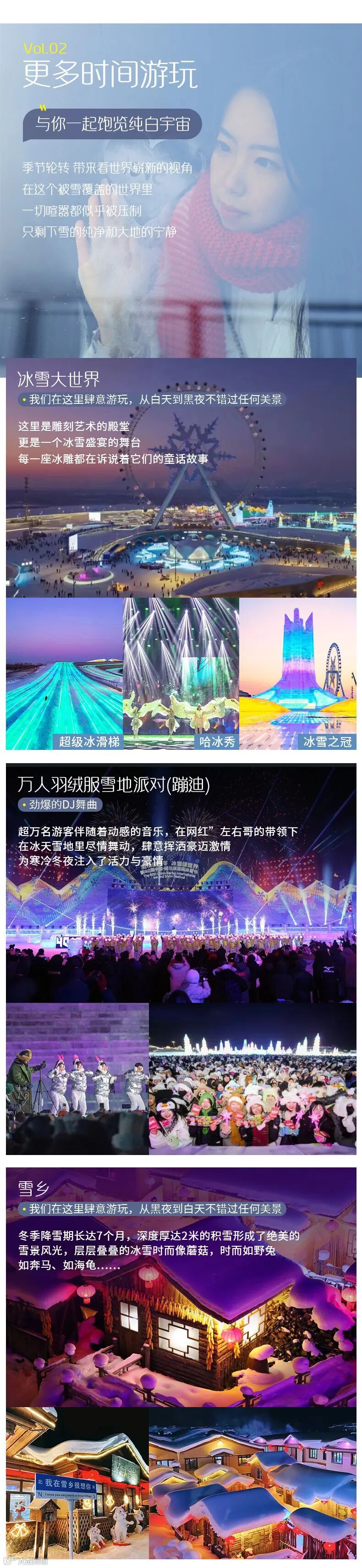 15:30 【冰雪大世界】用冰雕刻出的世界仿佛置身于梦境,伸手触碰到的每一寸冰雪好像都有了生命,白天纯粹无暇,是一种风格,傍晚夕阳衬托,反射着金光,像冬日的寂静。晚上亮起糖果配色的灯光,冰雪景观流光溢彩、炫丽无比。