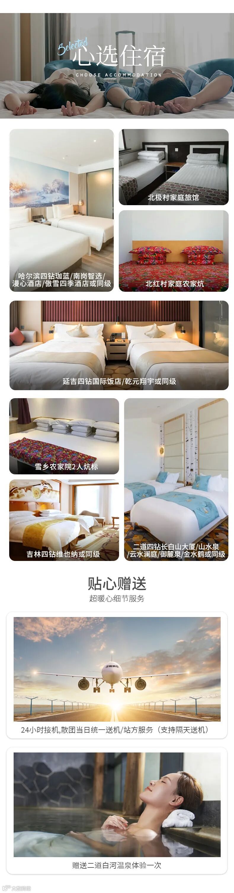 4、赠送一次长白山温泉体验(1.2米以下儿童和占床赠送,超高不占床不赠送)。