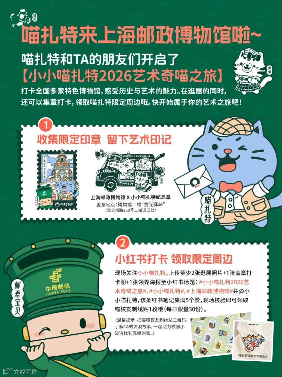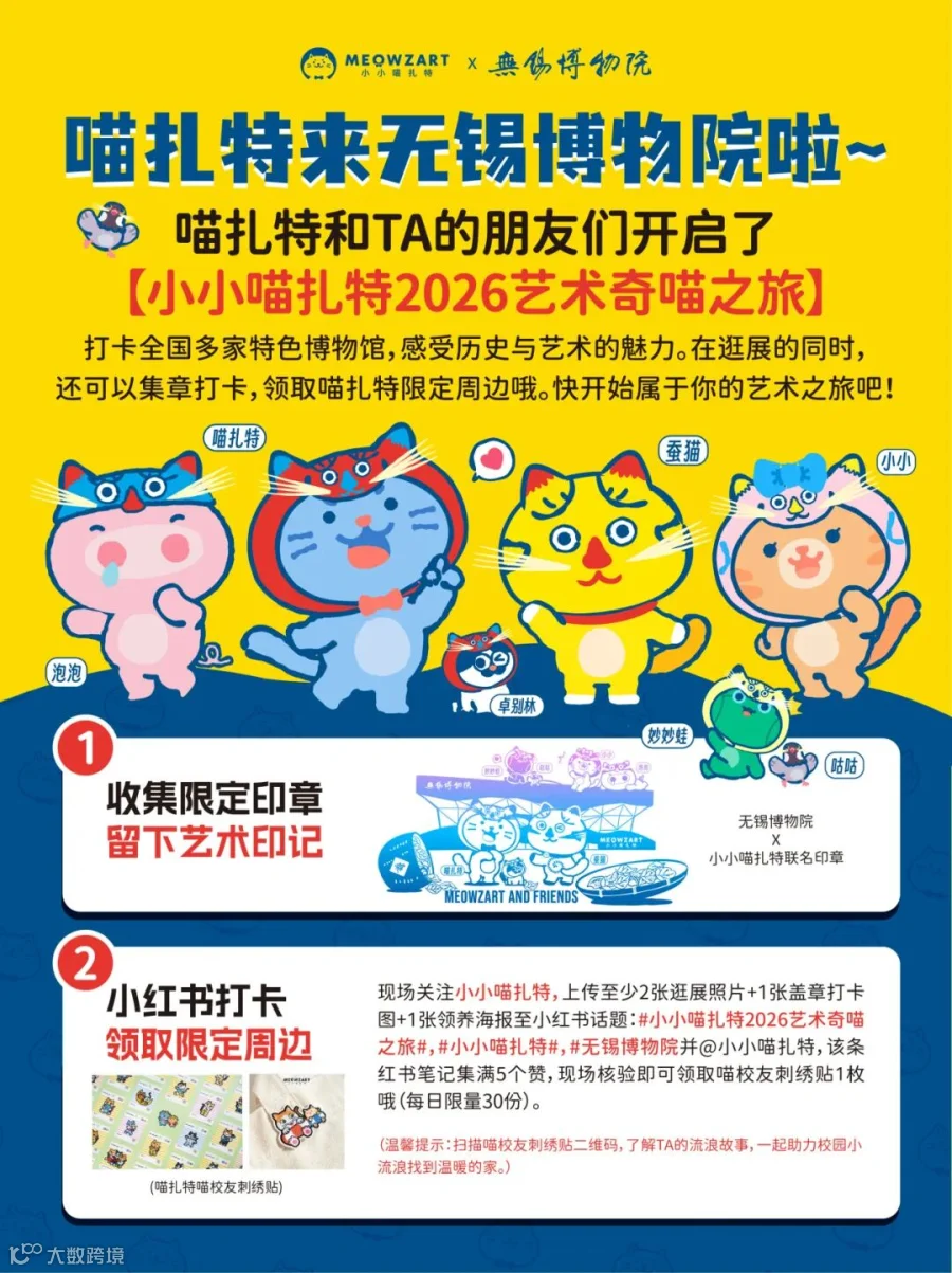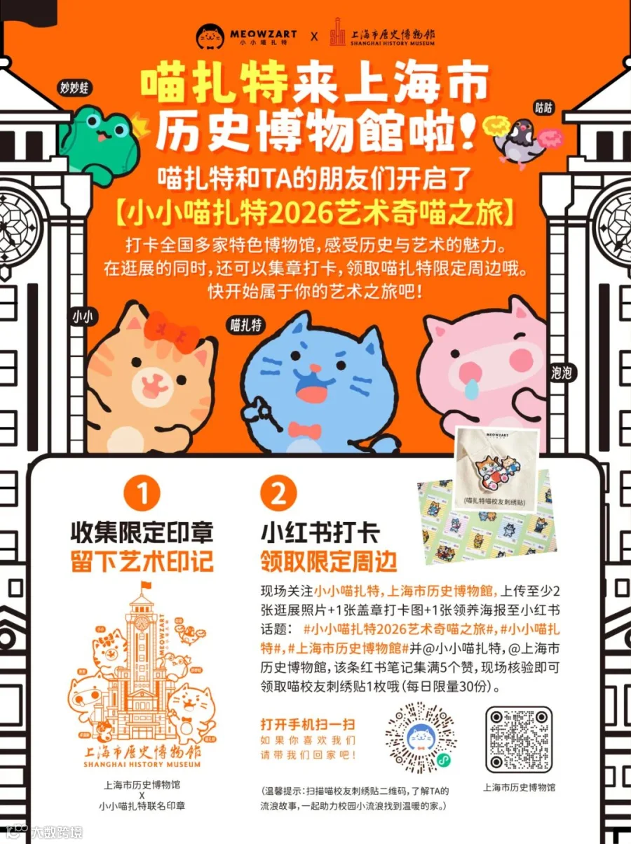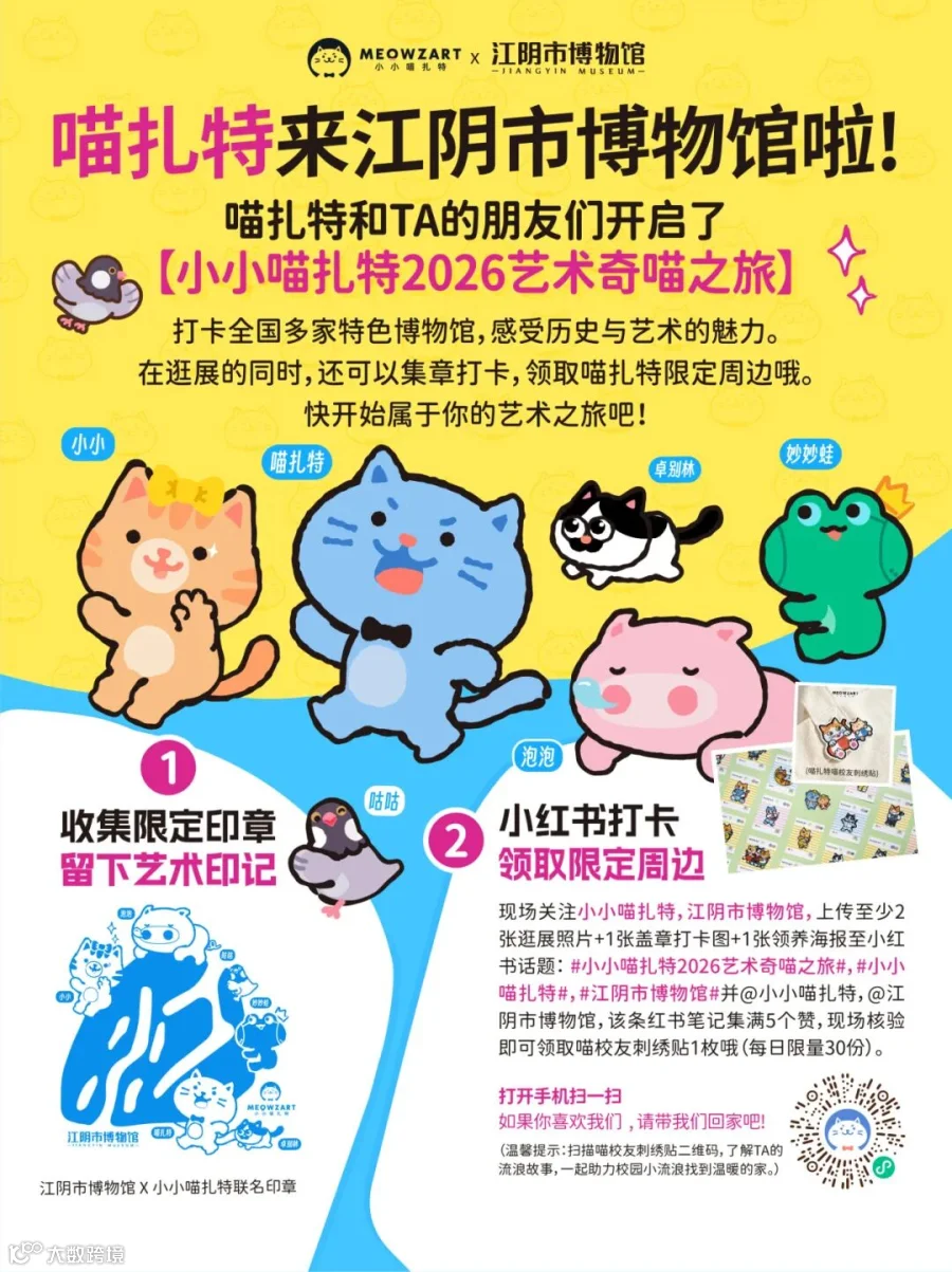 爱艺术的你们准备好了吗,跟喵扎特一起用脚步丈量文明,用印章收藏时光。【小小喵扎特2026艺术奇喵之旅】三大亮点,等你解锁!