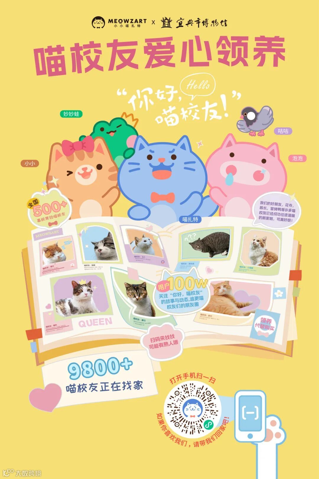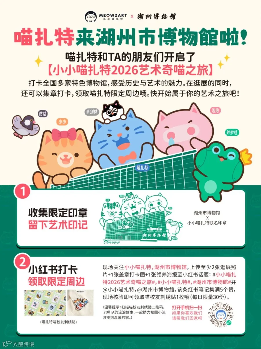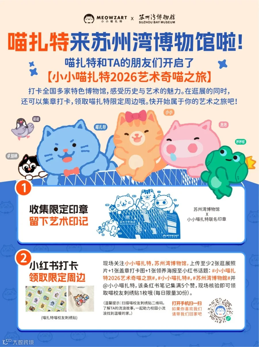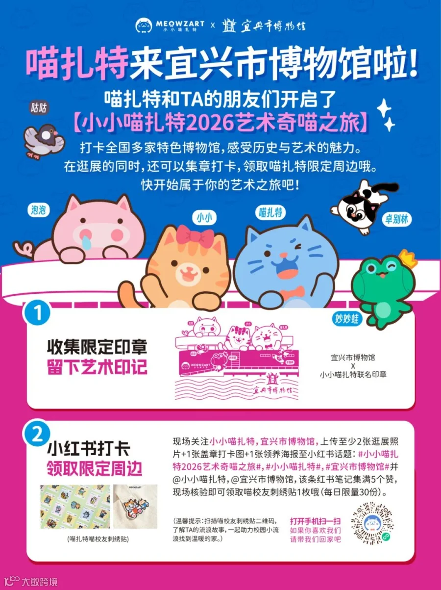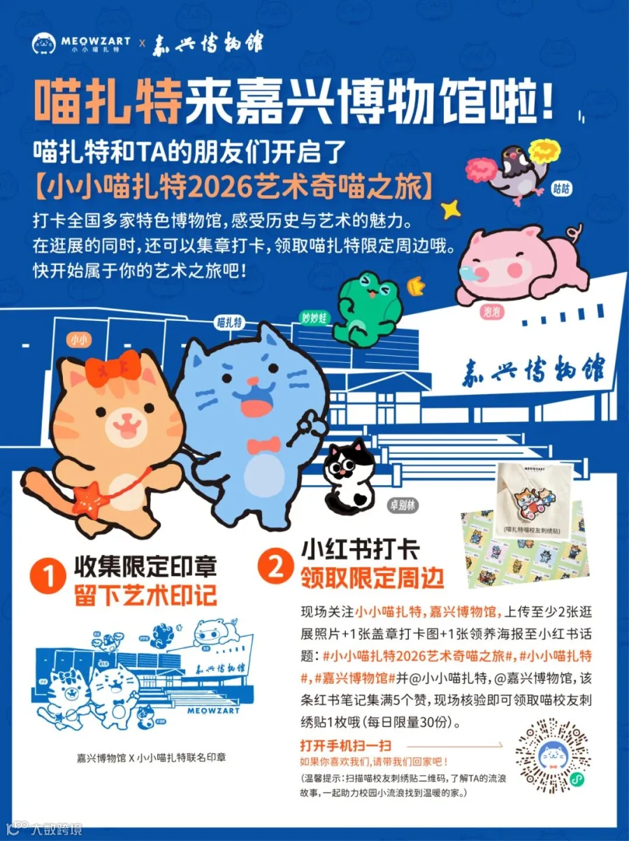 本次2026小小喵扎特文化之旅还有一个有爱的惊喜藏在这次十大江浙沪宝藏博物馆,那就是“喵校友爱心领养”,线下参观的游客欢迎扫码了解TA们的故事。值得一提的是,TA们都是有文化的喵哦!
