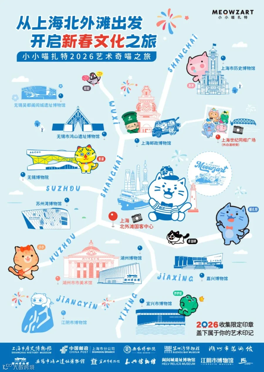 揭幕2026年度小小喵扎特艺术奇喵之旅长三角路线:上海邮政博物馆—上海市历史博物馆—无锡博物院—江阴市博物馆—宜兴市博物馆—无锡市鸿山遗址博物馆—无锡吴都阖闾城遗址博物馆—嘉兴博物馆—湖州市博物馆(市美术馆)—苏州湾博物馆