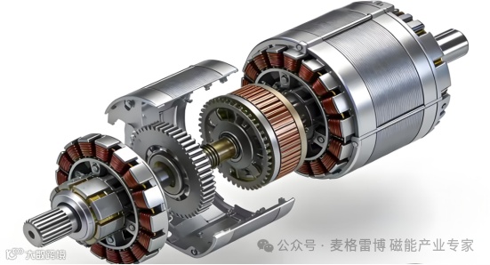 如果说感应电机赢在性价比,那永磁同步电机则赢在“高效与高性能”。它与感应电机最核心的区别,在于转子磁场的建立方式——不再依赖感应电流,而是采用高性能永磁体(主流为钕铁硼磁体,磁能积高、磁性能稳定)直接建立转子磁场,定子与转子磁场保持同步转动,因此得名“同步电机”。