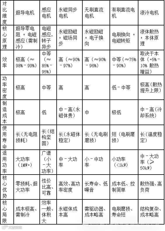 针对以上6款市场主流电机,从原理、效率、功率密度、成本、寿命、适用功率、优势、局限等不同维度进行对比,如下图:
