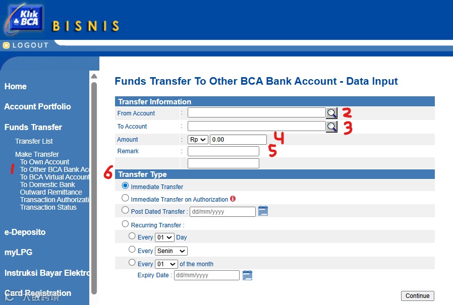 点击"至其他BCA银行账户"