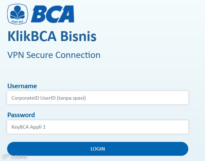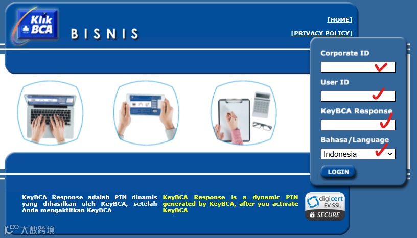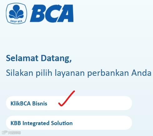 步骤 1: 登录您的BCA账户,首先在首页输入用户名,然后在keyBCA上输入PIN并按1以获取密码。点击登录,然后点击"KlikBCA Bisnis"(红色标记)。