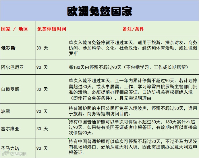 欧洲免签国家/地区:俄罗斯、白俄罗斯、阿尔巴尼亚、波黑、塞尔维亚、圣马力诺等6个。