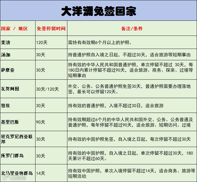 大洋洲免签国家:斐济、汤加、萨摩亚、瓦努阿图、基里巴斯、密克罗尼西亚联邦、所罗门群岛、北马里亚纳群岛等。