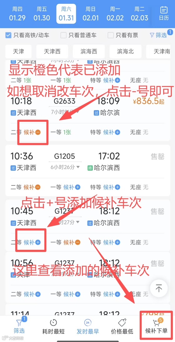 首先选好自己想要乘坐的车次,随后点击“候补+”添加进候补名单中,显示橙色即代表已添加,如想取消车次点击“候补-”即可。(右下角可查看自己添加的候补车次)