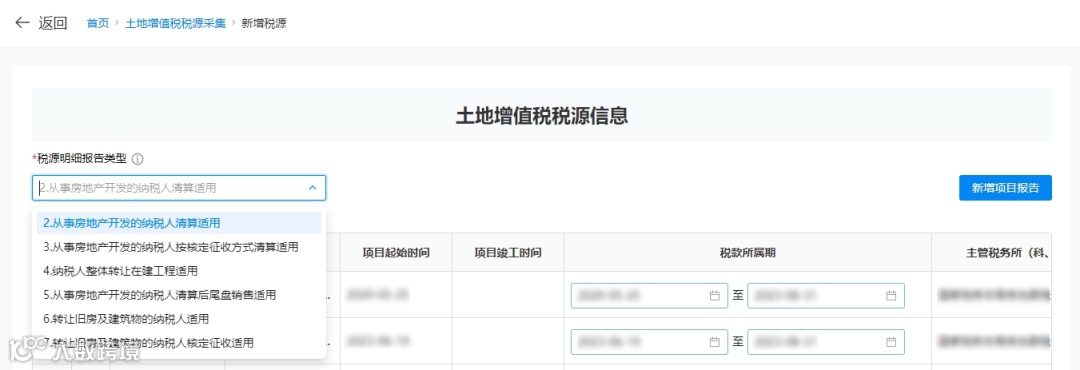 点击【新增税源】,进入土地增值税税源录入界面。报告类型包括:
