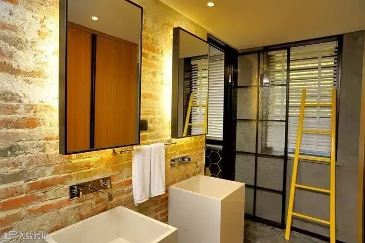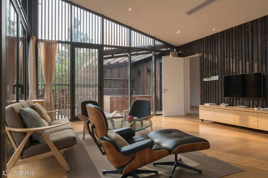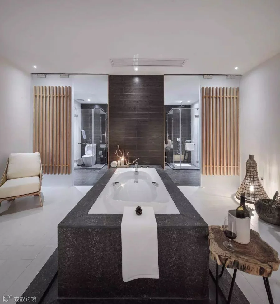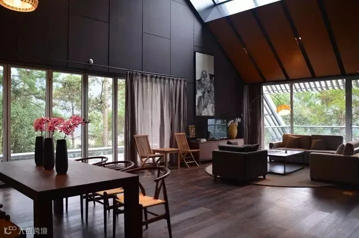 ▲与其他几栋别墅不同,16号别墅在进门口就开始有枯水庭院的意境,室内设计简约干练,卫生间的部分最为强调的概念是在山林阳光下沐浴。