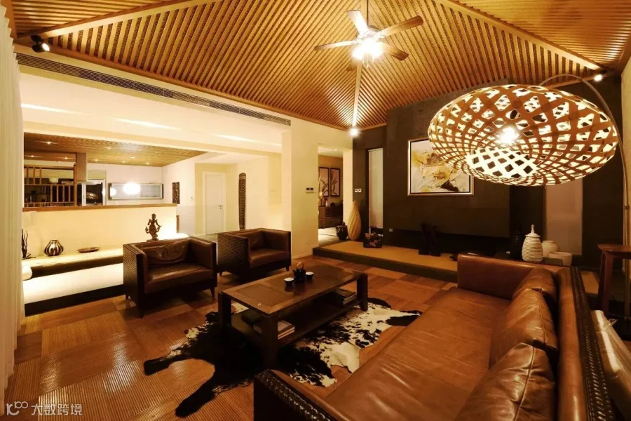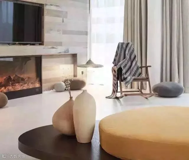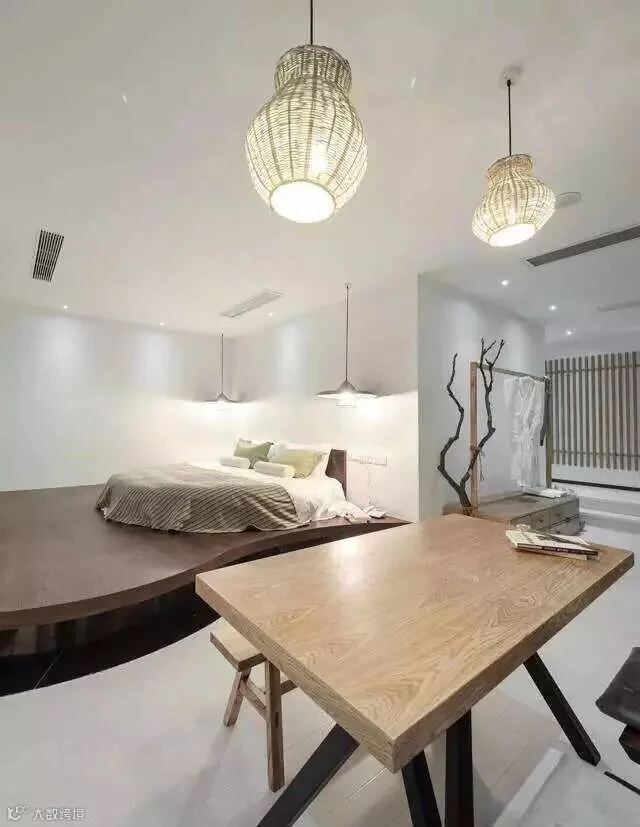 进入客房,最抢眼的便是客厅洁白的地板上的一组沙发,用一颗石子触碰水面那一刹那的波动作为沙发的形式出现,涟漪一般的撒出几轮优雅弧线,巧妙的成就了空间里的水动与静态。卧室区域用高低步阶划出,增加空间层次感。这里每一处角落都有等待你去发现的惊喜:由斗笠设计而成的灯罩、别具匠心的悬木挂架、特制的鹅卵石靠垫、无印良品的加湿香薰灯、古朴的自然风物……若是极简muji控住进来,每一件家具都想搬回家。