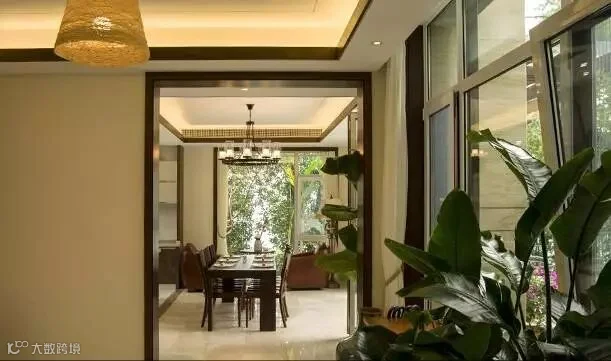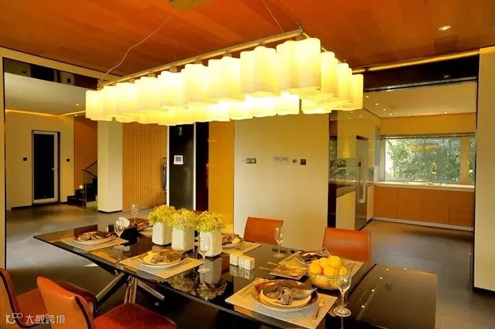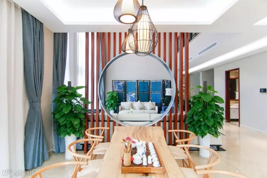 ▲中式,这里的中式风格是一种新的融合,现代化的材料却时不时透露着中国元素。客厅里的屏风、餐桌前的红木围栏、走廊上的水墨画……这一切都能体现出设计师的别有用心。