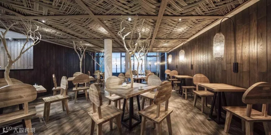 餐厅就像一个原木之美的展示空间,头顶、地面、桌椅均是原木打造。个性的天花设计灵感源自湘西那个远山远城的鱼米之乡,没有了城市的冷漠和疏离,带给人的是一种乡土风情的亲厚和温和。