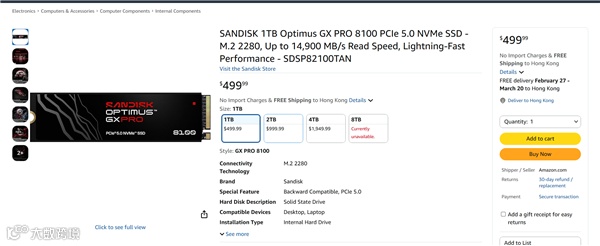 闪迪Optimus GX Pro 8100系列SSD目前已经在美亚上架,该系列就是之前的WD Black SN8100,属于旗舰级SSD硬盘,PCIe 5.0的,速度可达14.9GB/s。