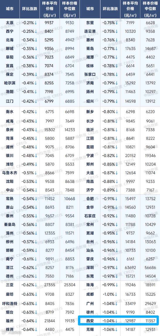 中指研究院数据《百城价格指数报告》显示,2026年1月西安二手房价格环比下跌1.04%。