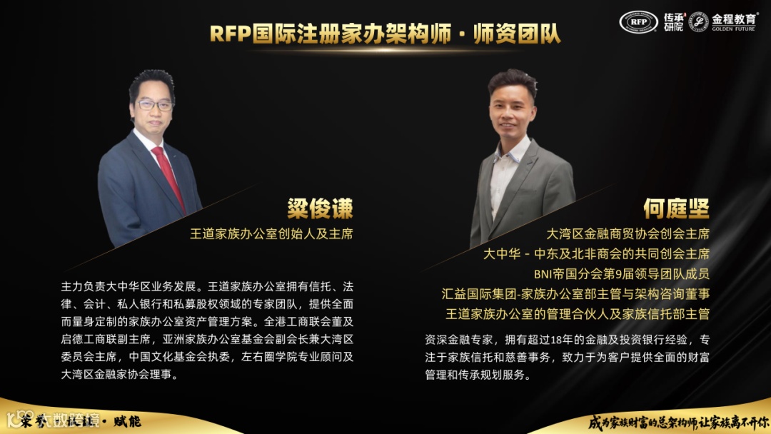 RFP国际注册家办架构师认证构建了“学术引领+实战操盘+跨界赋能”三维一体的师资团队,平均从业经验超15年,覆盖家办运营、信托设计、跨境税务等全领域。