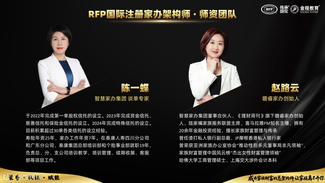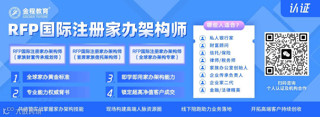 而这正是家办架构师的历史性机遇。家办架构师需要系统性地掌握全球传承工具的精髓,深刻理解家族治理的内核,并具备协同各类专业机构的能力。RFP国际注册家办架构师认证课程,帮助家办架构师以客户家族长期福祉为核心,从模式洞察、工具应用、国际视野各维度,构建即学即用的家办架构能力,打开高净值客户市场。