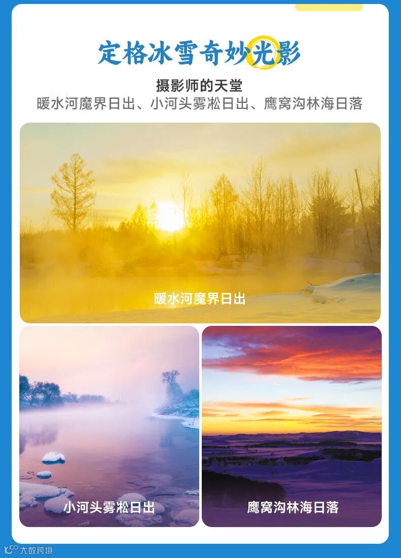 今天我们要早起,乘坐越野车前往号称“魔界”的【暖水河】观赏日出(车程约40分钟),我们在坡顶支好摄像设备,可以看到沟地的河流还有未冻结的部分,日出时分水雾蒸腾起来,烟雾缭绕...太阳逐渐从地平面升起,从远方的山坡间“挤”了出来,天边的云从暗青色转为了暖橘色、粉色...大家要耐心等待日出,一定不会让你们失望!