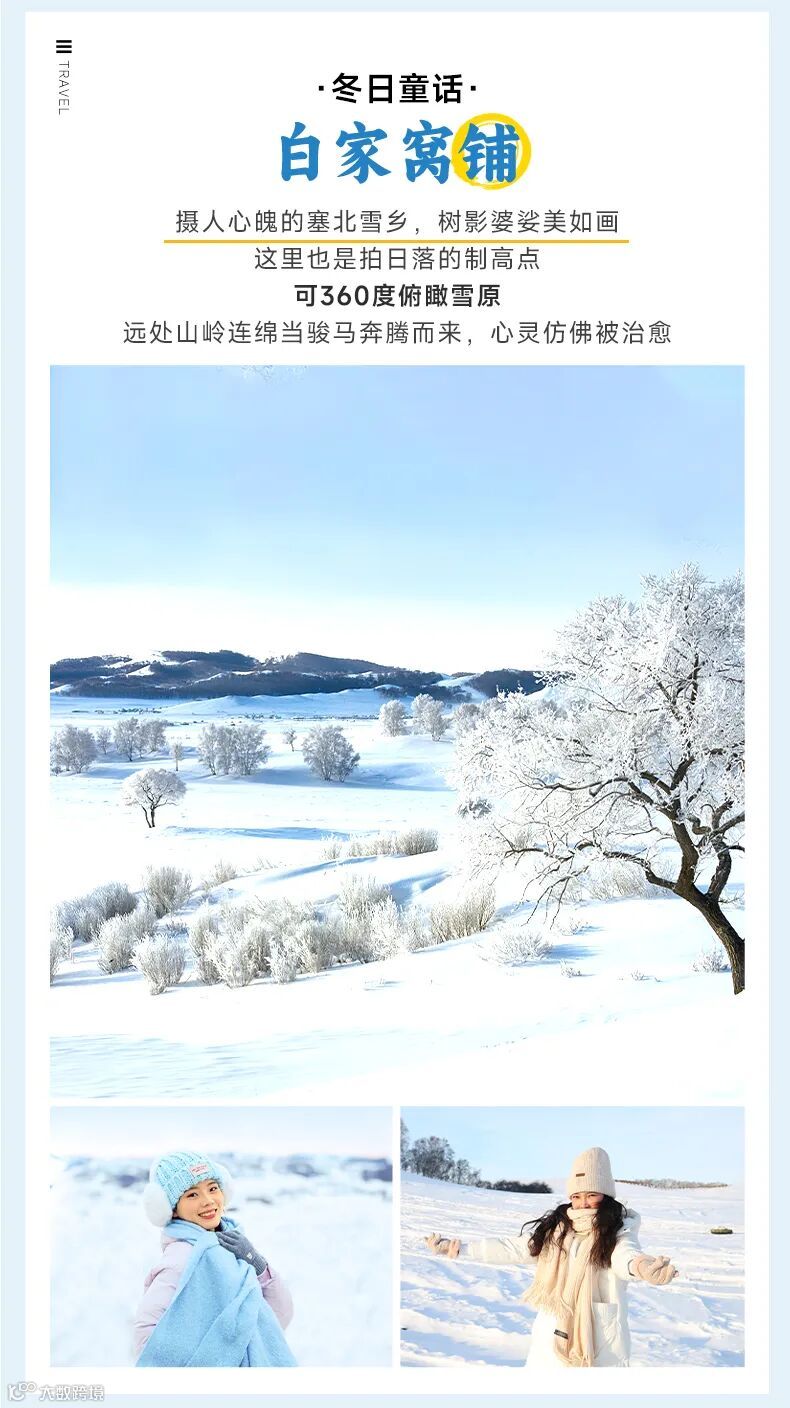 随后返回酒店午餐,稍作休息之后,下午前往【塞北雪乡】【白家窝铺】玩雪、看日落。我们可以堆雪人、打雪仗......多种游玩项目带你找回童年的简单童趣,感受最纯粹的快乐!这里有雪丘之上的排排白桦林,在夕阳照射下白桦树干与白雪争辉,长长的树影拖在雪丘之下,层次分明。