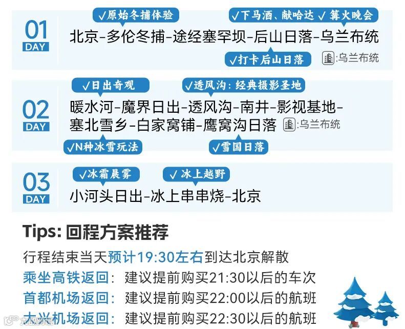 2. 行程内时间都为计划时间,如遇暴雪、堵车等情况,具体行程由领队安排。