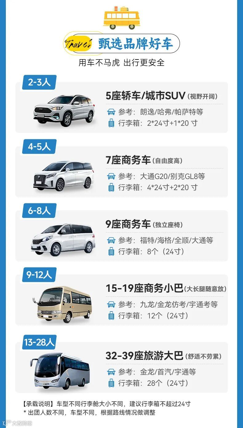 注:8人内司机兼向导(含8人),8人以上安排1名资深领队