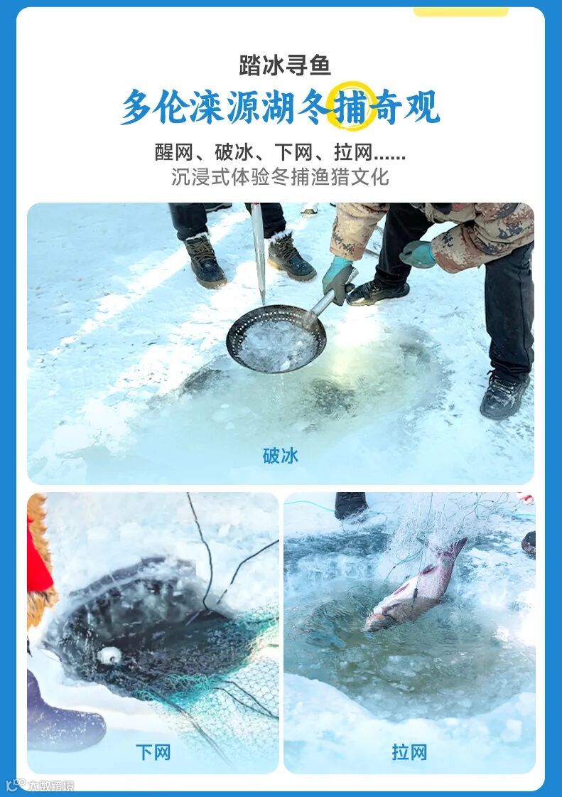 午餐后到达多伦滦源湖畔体验【冬捕】,这是北方独有的捕鱼方式,在厚厚的冰面凿出窟窿,用渔网下入水里进行捕鱼,这里虽然没有查干湖那样壮观的大规模捕鱼表演,但是可以看到当地渔民日常的捕鱼工作。可以亲自参与其中,凿冰、下网、拉网,亲身体验冬捕的乐趣!随后在湖面体验冰雪娱乐滑冰车、坐龙舟、滑雪圈、抽冰嘎...