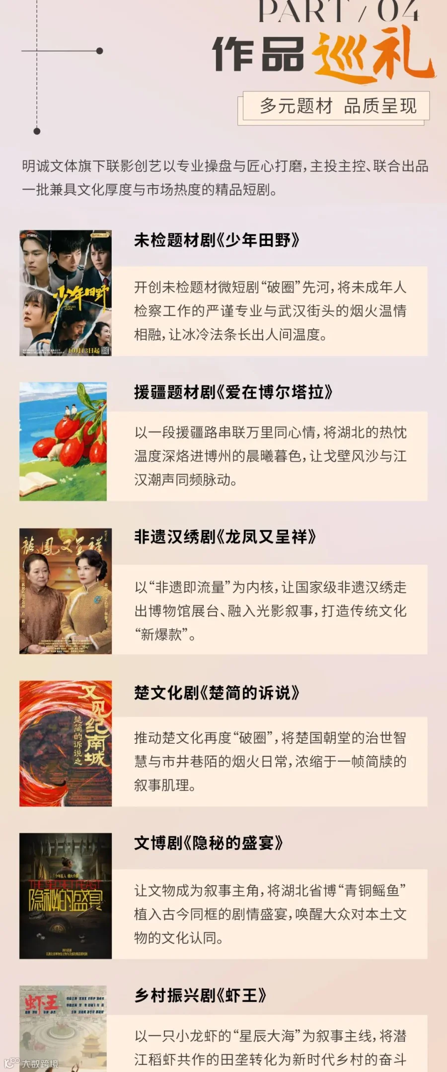 湖北联影创艺文化传媒有限公司成立于2024年2月28日,是湖北联投旗下控股上市公司当代明诚全资子公司。在新文化生态下,链接行业上下游,以“文化+产业融合发展”为基础,优化布局文化+影视、文化+演艺、文化+文旅三大业务赛道。