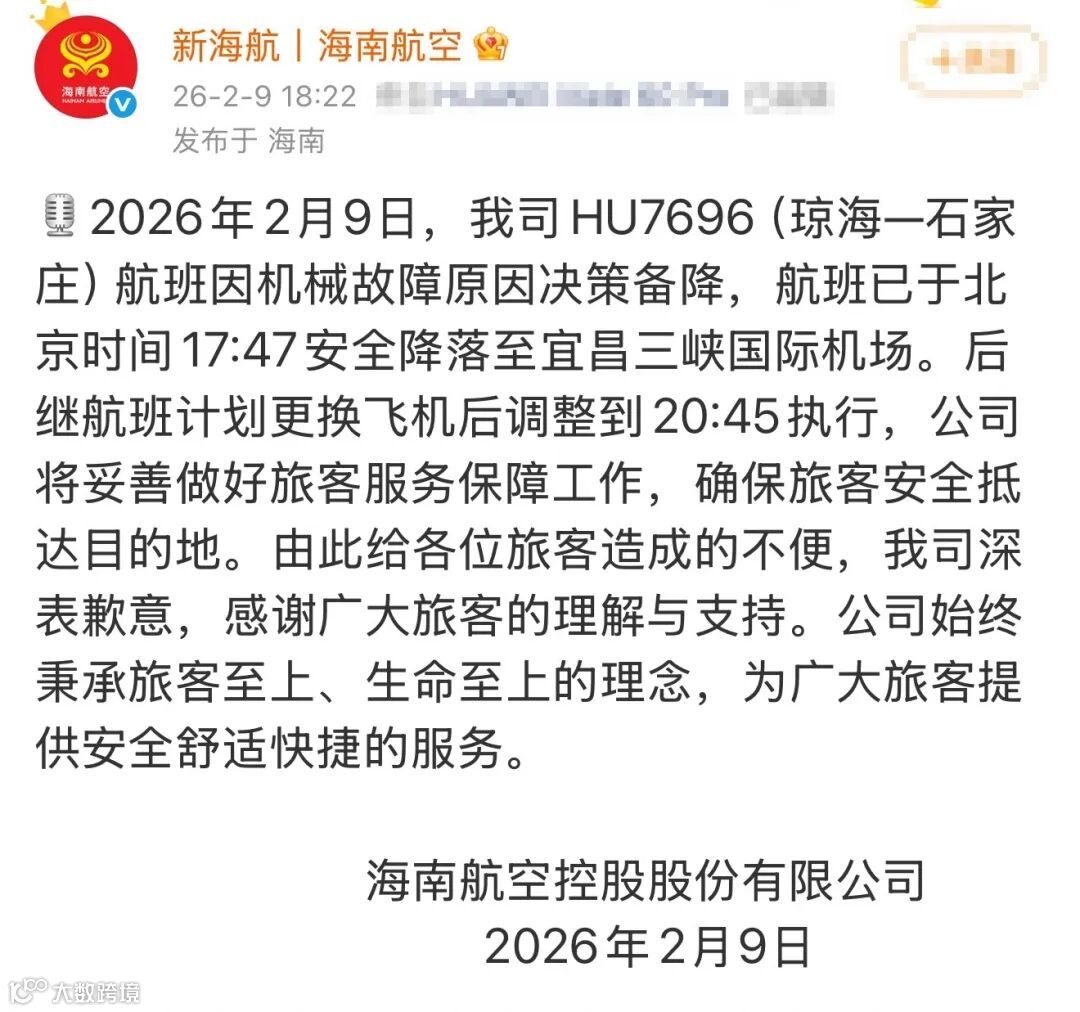 • 2月9日,海南航空控股股份有限公司发文:当天,我司HU7696(琼海—石家庄)航班因机械故障原因决策备降,航班已于北京时间17:47安全降落至宜昌三峡国际机场。后继航班计划更换飞机后调整到20:45执行。由此给各位旅客造成的不便,我司深表歉意,感谢广大旅客的理解与支持。