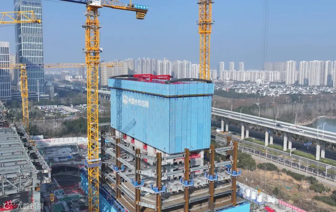 “它如同一个包裹在建筑核心筒外的巨型‘钢铁外衣’,自带堆载平台、防护系统和顶升系统,会自己安全稳定地向上爬升。”中铁四局合肥轨道线网控制中心及甘棠置业项目工程部技术主管曹赛飞告诉记者,这台造楼机通过8组液压千斤顶协同工作,将包括施工平台、养护系统甚至小型加工设备在内的整个作业面,一次性顶升到新的楼层,精度控制在毫厘之间。
