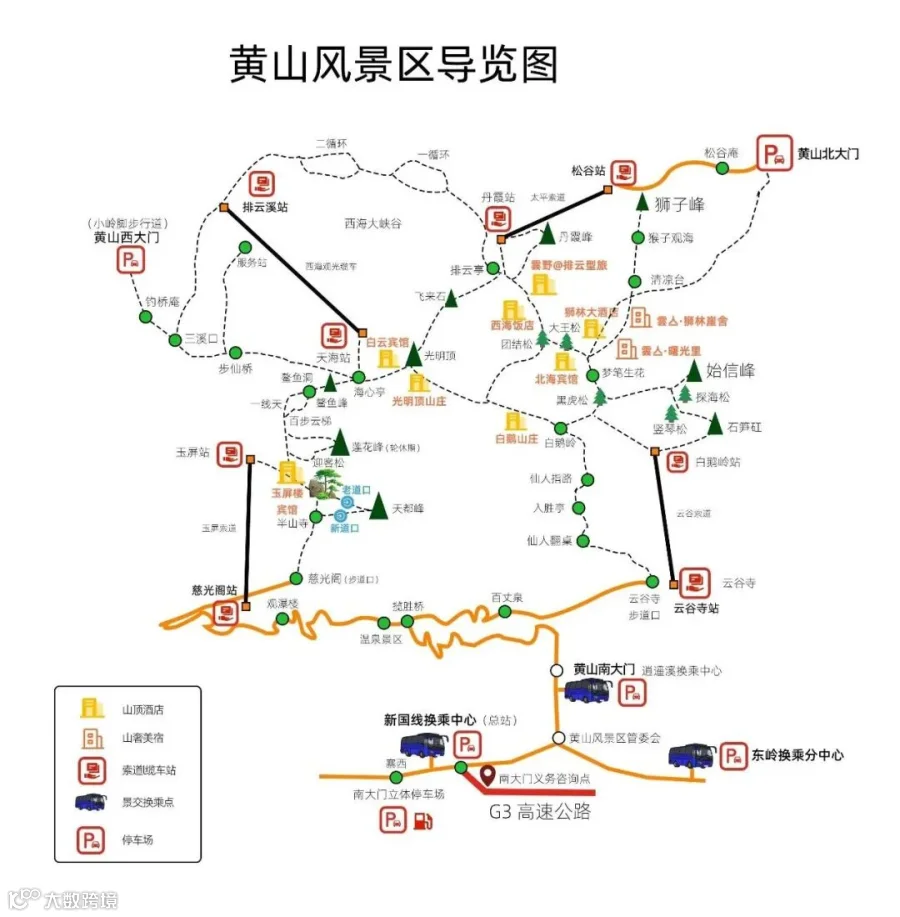 (南门进北门出)路线:黄山南大门入→云谷索道上→石笋矼→始信峰→梦笔生花→曙光亭→清凉台→猴子观海→狮子峰→光明顶→飞来石→丹霞峰→太平索道下→黄山北大门出